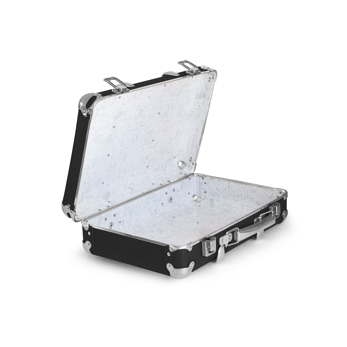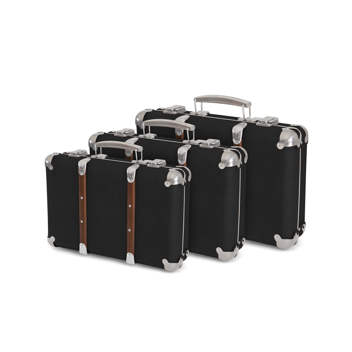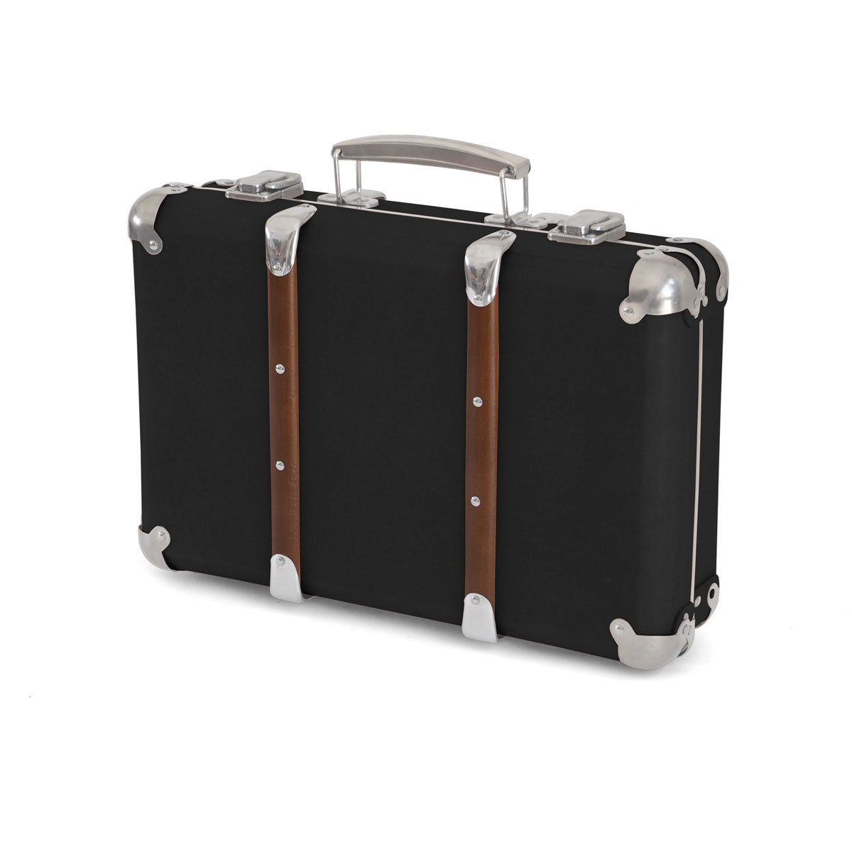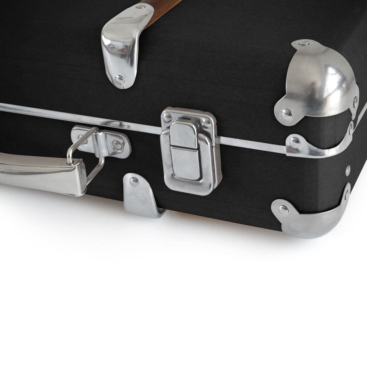 28 x 39,5 x 13,5 cm. Cartón + Madera. Valija mediana de cartón con refuerzos de madera. Herrajes, esquineros y manijas metálicos.