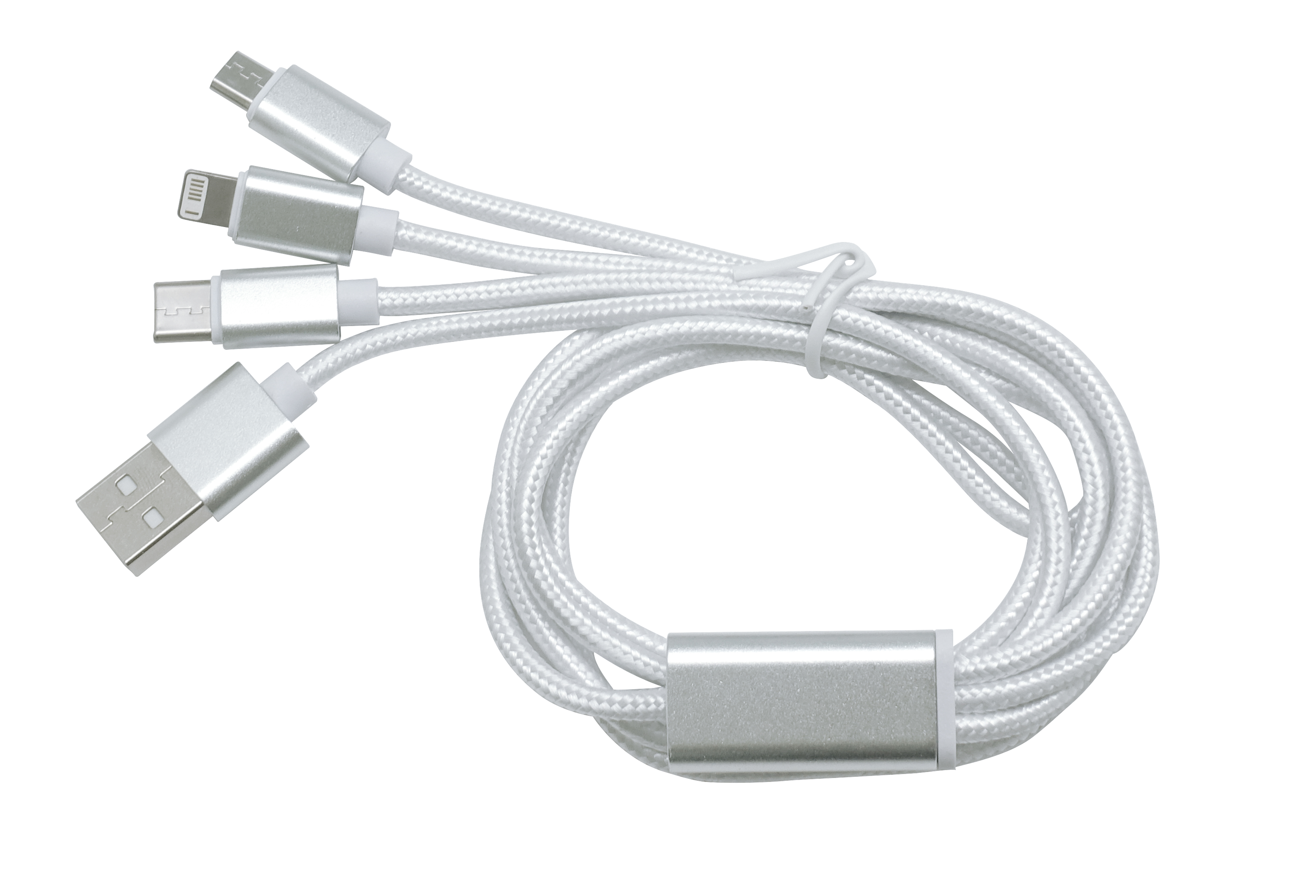 Aluminio y Nylon. 120 cm. Cable con entrada USB y diferentes adaptadores: Iphone, Type C y Android. Viene dentro de una bolsa plásticas con cierre ziploc. Carga rápida de 2,1 a.