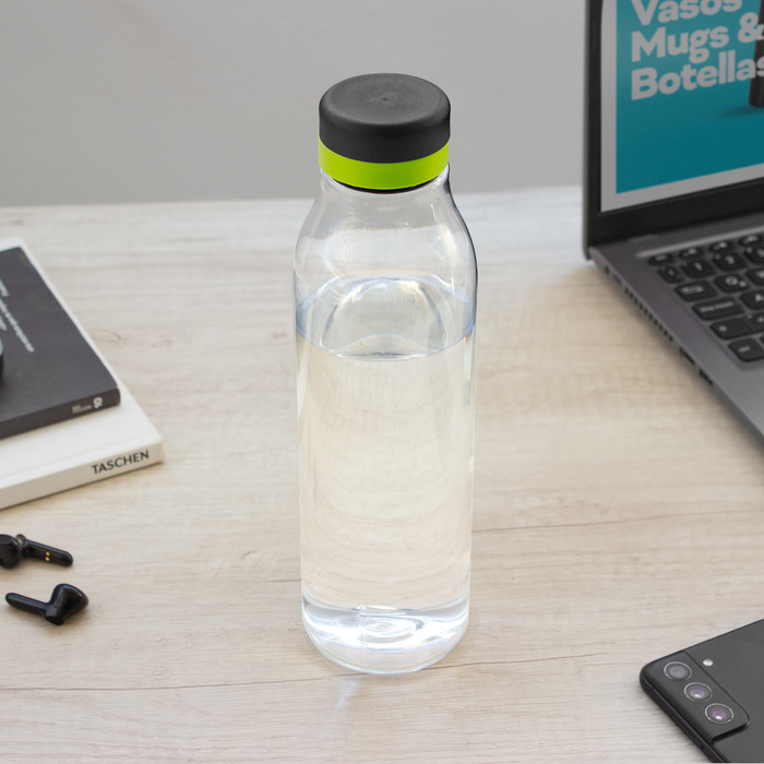 Botella de plástico transparente con tapa a rosca color negro mate con anillo de silicona de diferentes colores.