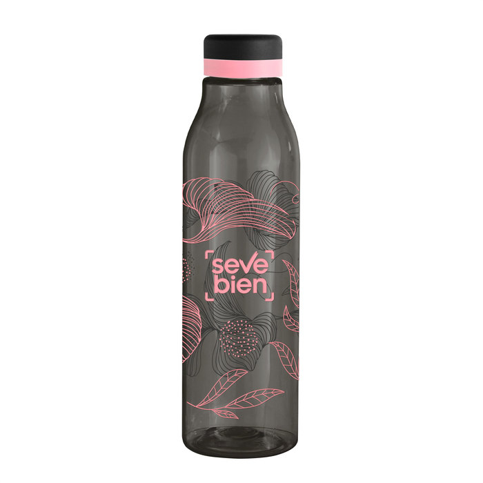 Botella de plástico color negro con tapa a rosca color negro mate con anillo de silicona de diferentes colores.