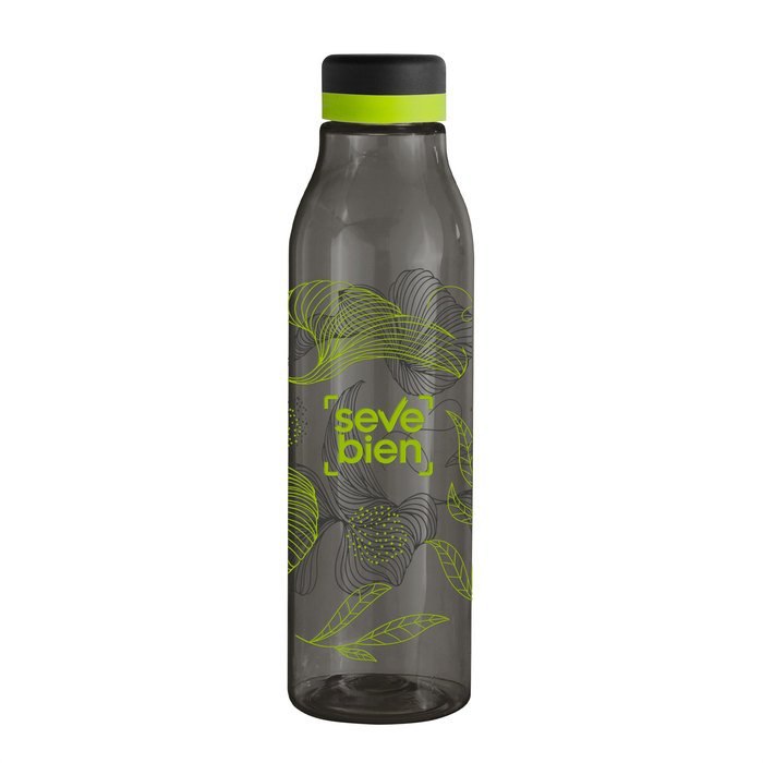 Botella de plástico color negro con tapa a rosca color negro mate con anillo de silicona de diferentes colores.
